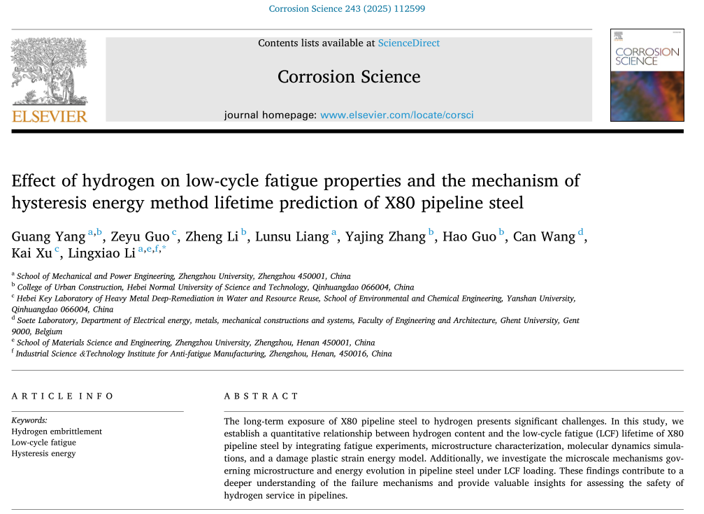近日,db真人体育官网青年教师杨光博士以第一作者身份在腐蚀领域顶级期刊《Corrosion Science》(中国科公司一区,IF=7.9)上发表题为“Effect of hydrogen on low-cycle fatigue properties and the mechanism of hysteresis energy method lifetime prediction of X80 pipeline steel”的高水平研究论文。论文通过组织演变、损伤力学、疲劳性能评价和疲劳寿命预测等方面对X80高应变管线钢的低周疲劳性能进行了全面的研究。本研究系统分析了不同氢含量和不同应变幅值下的X80高应变管线钢微观组织特征与循环响应的关系。在此基础上,通过建立分子动力学模型和氢含量的迟滞能量疲劳寿命预测模型对X80高应变管线钢疲劳性能进行了评价。这有助于理解充氢X80管线钢疲劳断裂机制和临氢服役寿命的预测与评价。