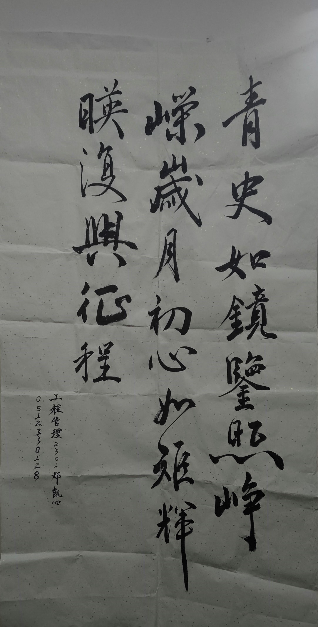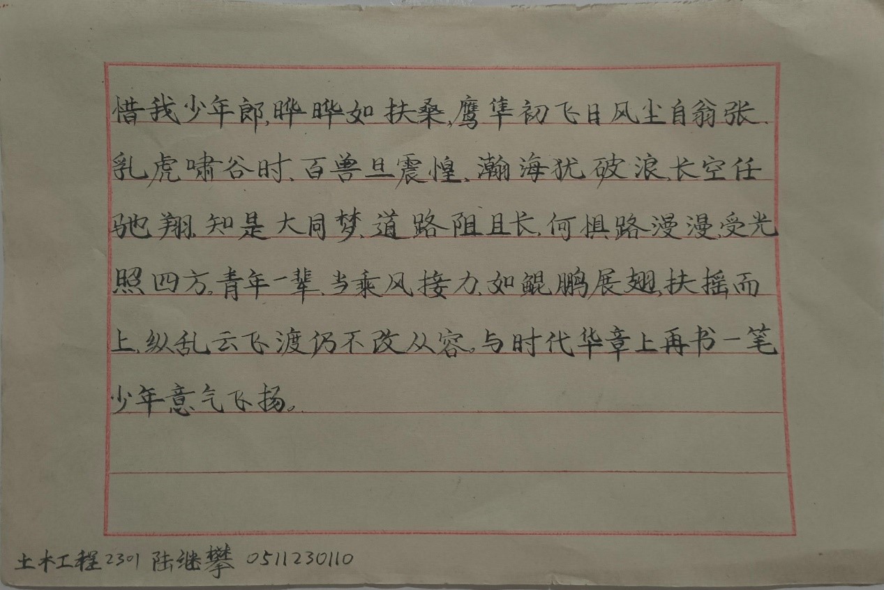 本次大赛设立了硬笔组与毛笔组两个类别,受到众多书法爱好者的关注,共上交167份作品。每一幅作品都是参赛者心血与智慧的结晶,从笔法的精妙运用到整体布局的巧妙构思,无不展现出他们对书法艺术的深刻理解和独到见解。经过紧张激烈的角逐,最终评选出了各个奖项。其中,侯朝骞同学的毛笔书法作品荣获一等奖,他的作品以精湛笔法、和谐布局和深厚文化内涵脱颖而出,展现了其深厚的书法功底与长期不懈的技法实践。
