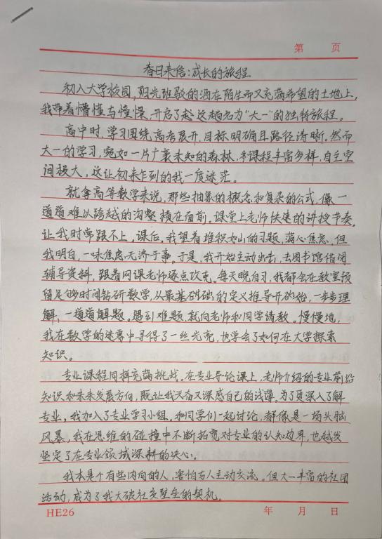 本次活动鼓励同学们从个人视角出发,通过文字讲述自己的成长经历,敞开心扉,分享成长感悟与收获。评委从作品文笔及故事内涵等方面评选出获奖作品。汤凯越同学通过细腻的笔触描写了自己学习成长的经历,荣获一等奖,二等奖获奖同学为倪梓晗、张雅楠,三等奖获奖同学为谢鑫沂、钱坤、吴玉川。