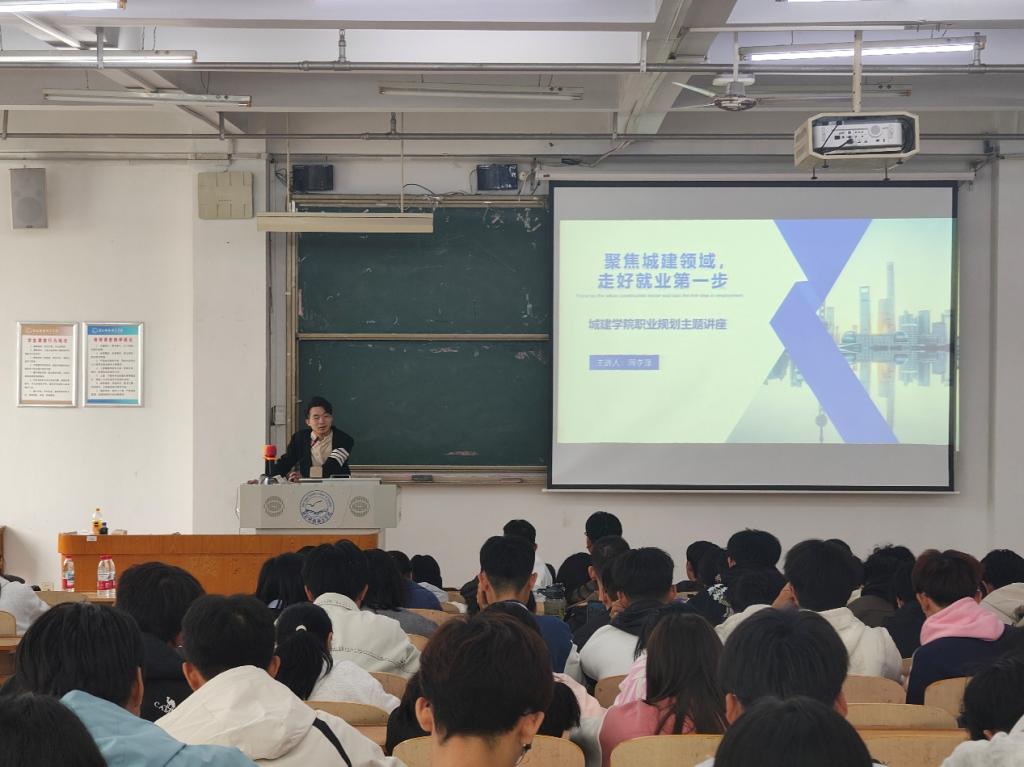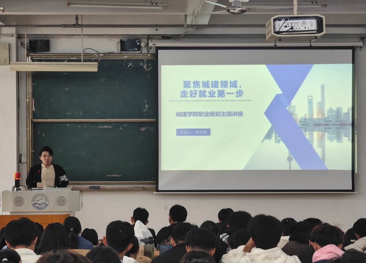 讲座中,周李泽结合自身求学与求职经历,指出城建领域涵盖基础设施建设、建筑设计等多个方面,受 “新型城镇化”“城市更新” 等国家政策影响,行业对复合型、实践型人才需求增加,对求职者专业能力、项目经验和职业素养要求也增强,强调校园理论是 “地基”,需主动依据行业需求,为建设行业“添砖加瓦”。他针对求职筹备、学长从简历和笔试两方面分享技巧:简历要 “靶向投递”,突出与岗位相关的课程成绩、实践经历和技能证书;笔试需重点复习高等数学、材料力学等专业基础科目,并了解目标企业业务方向。在互动环节,他就 “实习单位选择”“跨专业求职可能性”“考研与就业准备平衡” 等问题进行详细解答。